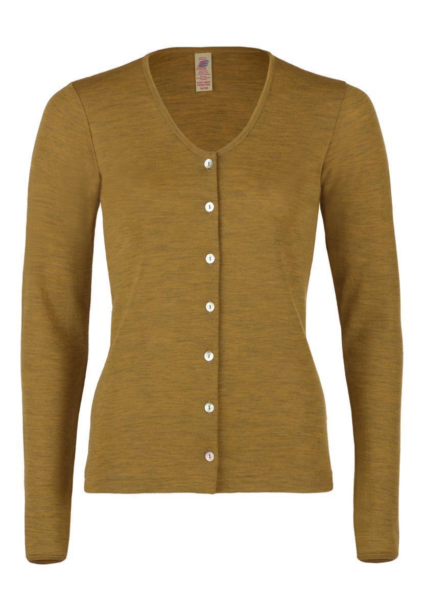 Leichter Cardigan aus Bio-Wolle. Geschlossen wird er mit 7 Knöpfen aus Perlmut. Er hat einen leichten V-Halsausschnitt, lange Ärmel und ist an den Kanten mit einem kleinen Bändchen veredelt.